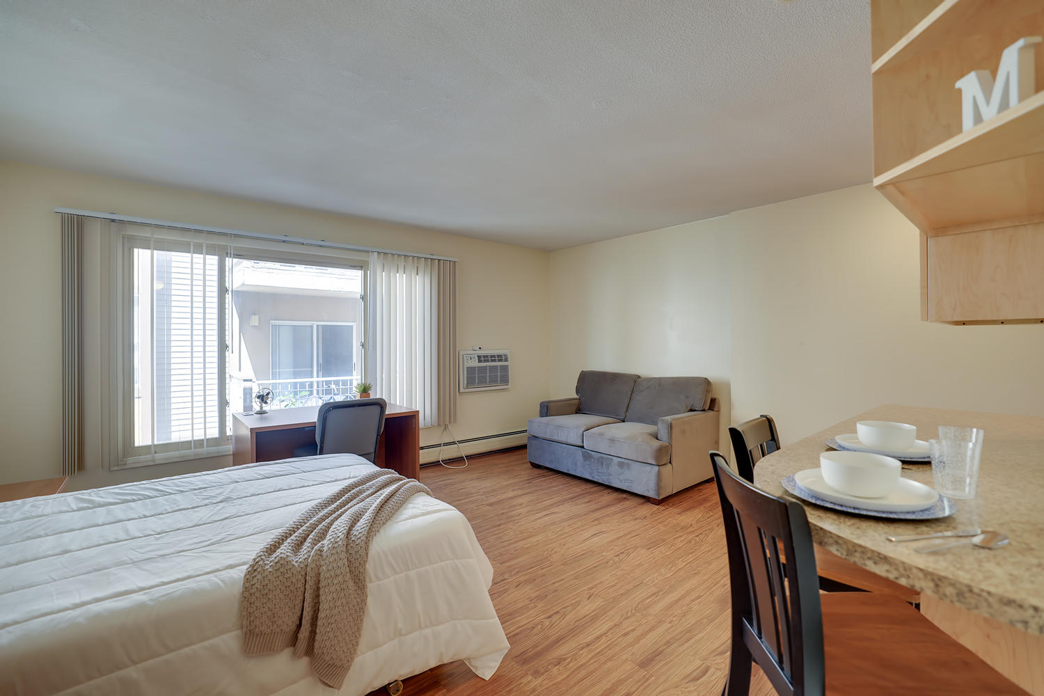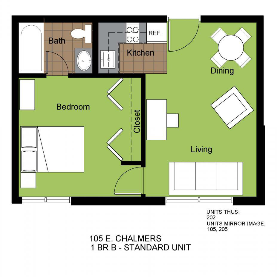 These bright and spacious Champaign apartments are just 3 blocks from Green Street and a short walk to the Main Quad. Units feature substantial natural light and ample storage including a large closet and dresser.