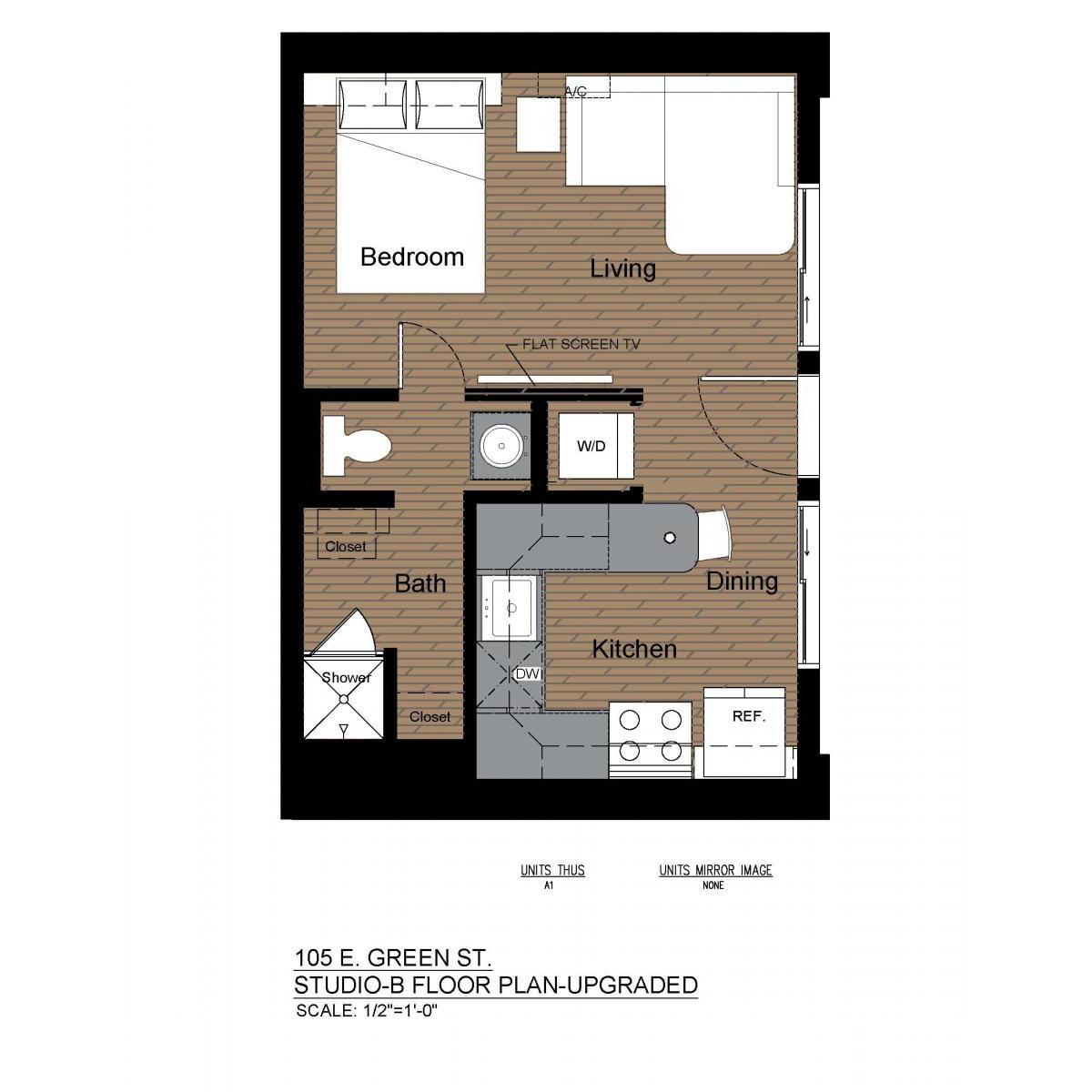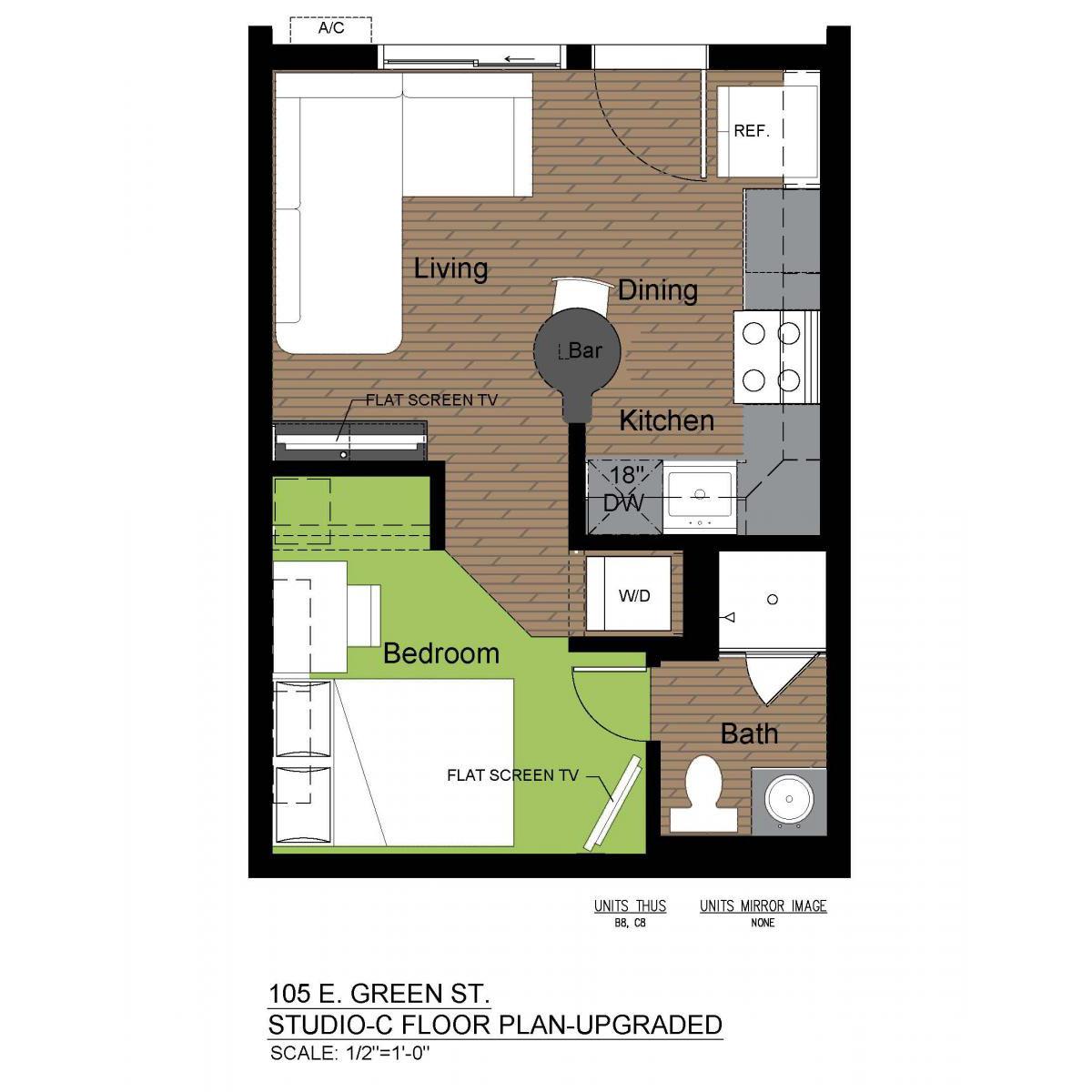 Sitting on the edge of Campustown, this building is right down the street from Target, Walgreens, and the many dining and entertainment options on Green Street. These fully loaded units offer an open living/dining area, walk-in showers with a rainfall showerhead, smart TVs in the living room and bedroom, and in-unit laundry.